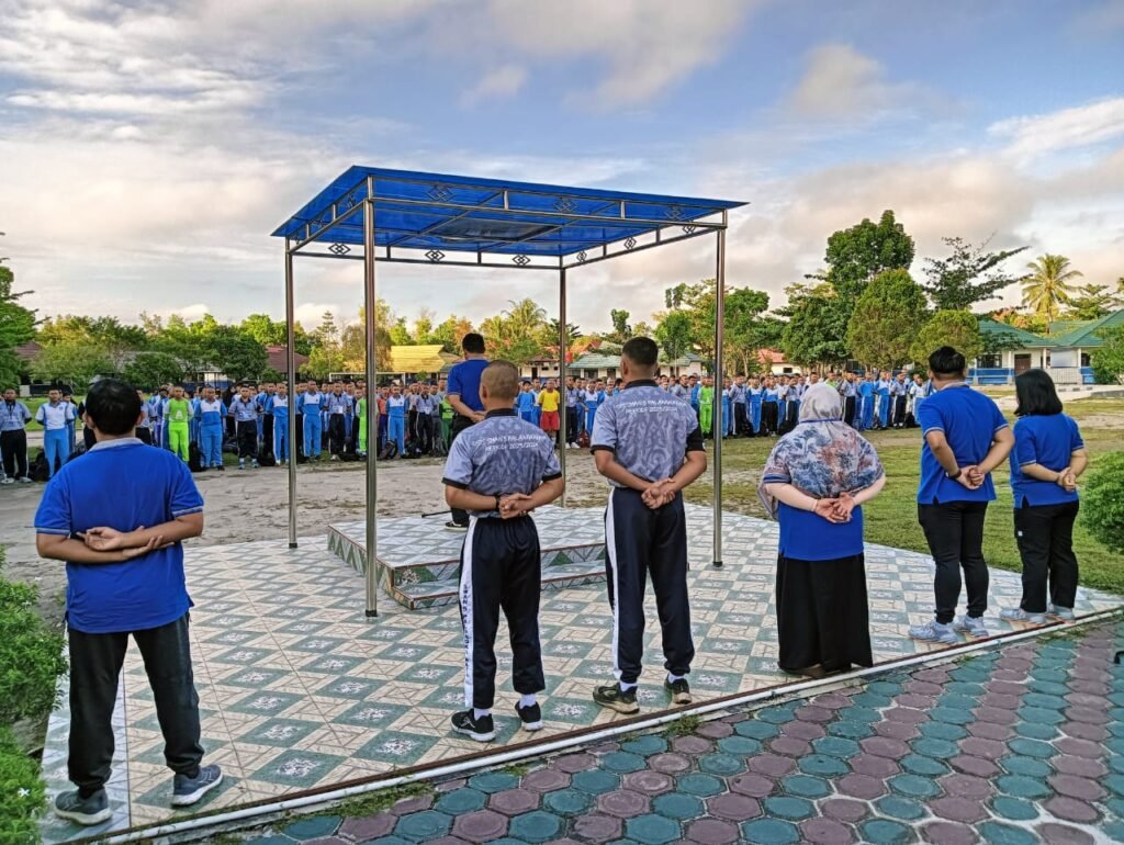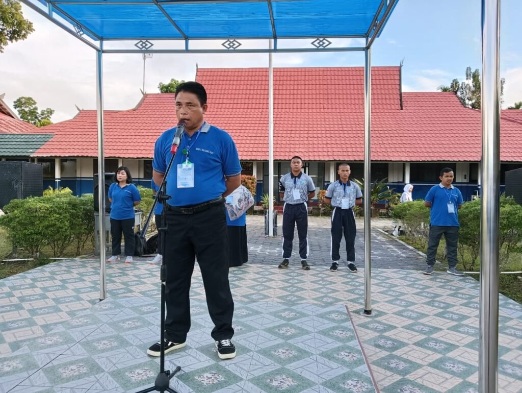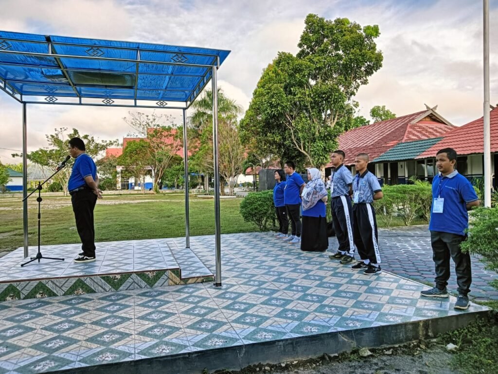Wakasek Kesiswaan Jonkenedy, S.Pd.,M.Pd., memberikan penjelasan langsung di halaman sekolah kepada peserta didik baru yang berbaris rapi. Mereka tampak mengenakan pakaian olahraga dari SMP/MTs asalnya.