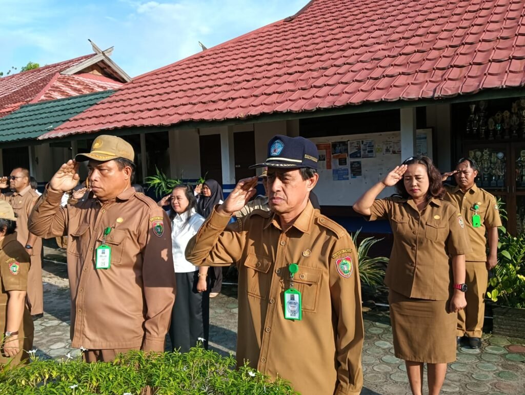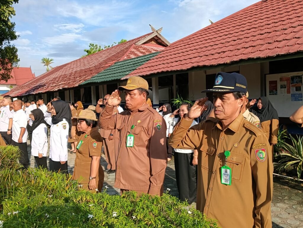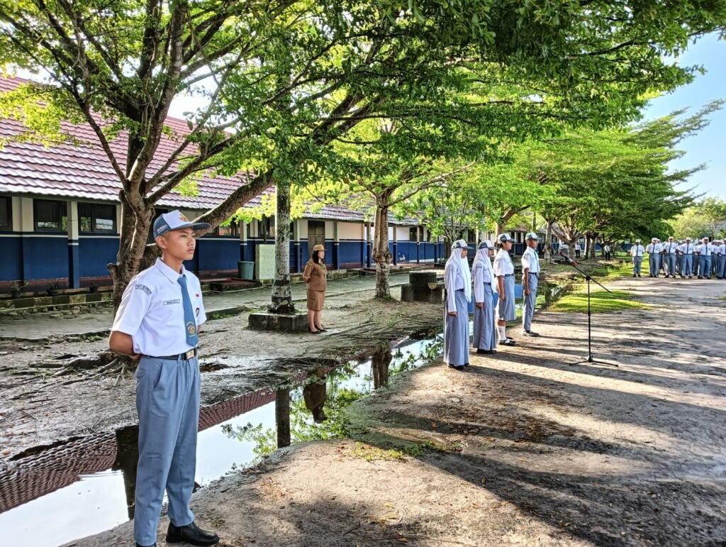 Halaman sekolah yang sebagian tergenang air dampak hujan semalam tampak berkilauan ditimpa sinar matahari pagi yang cerah dan terasa hangat. Para siswa, guru, dan staf tampak berdiri khidmat.