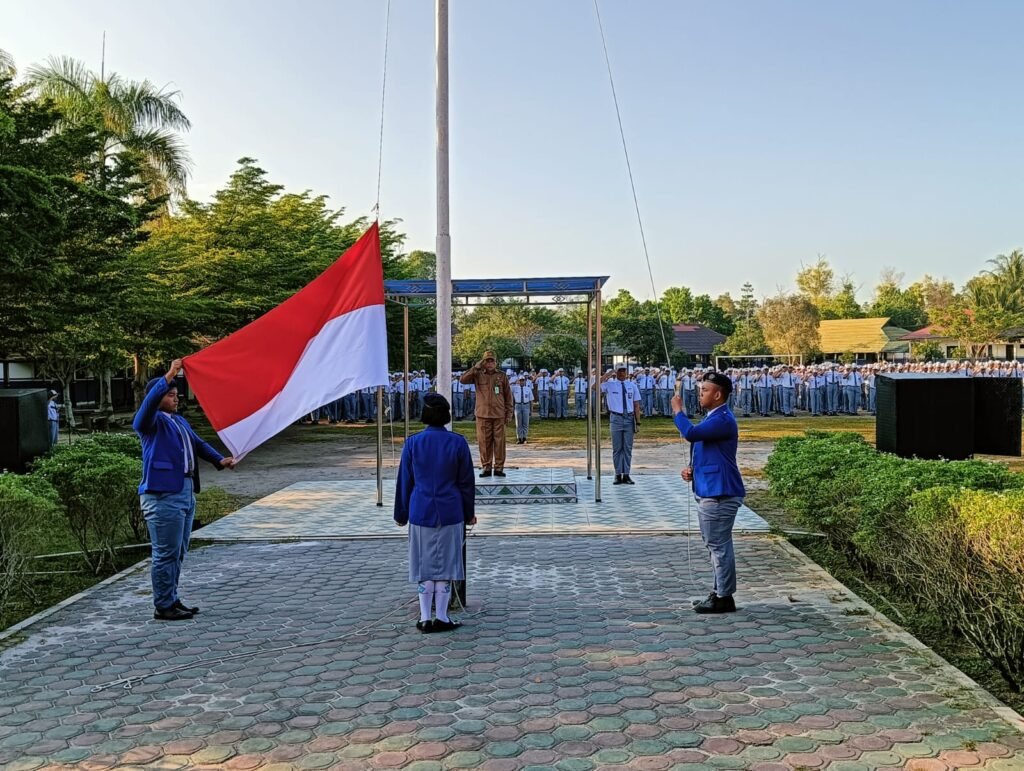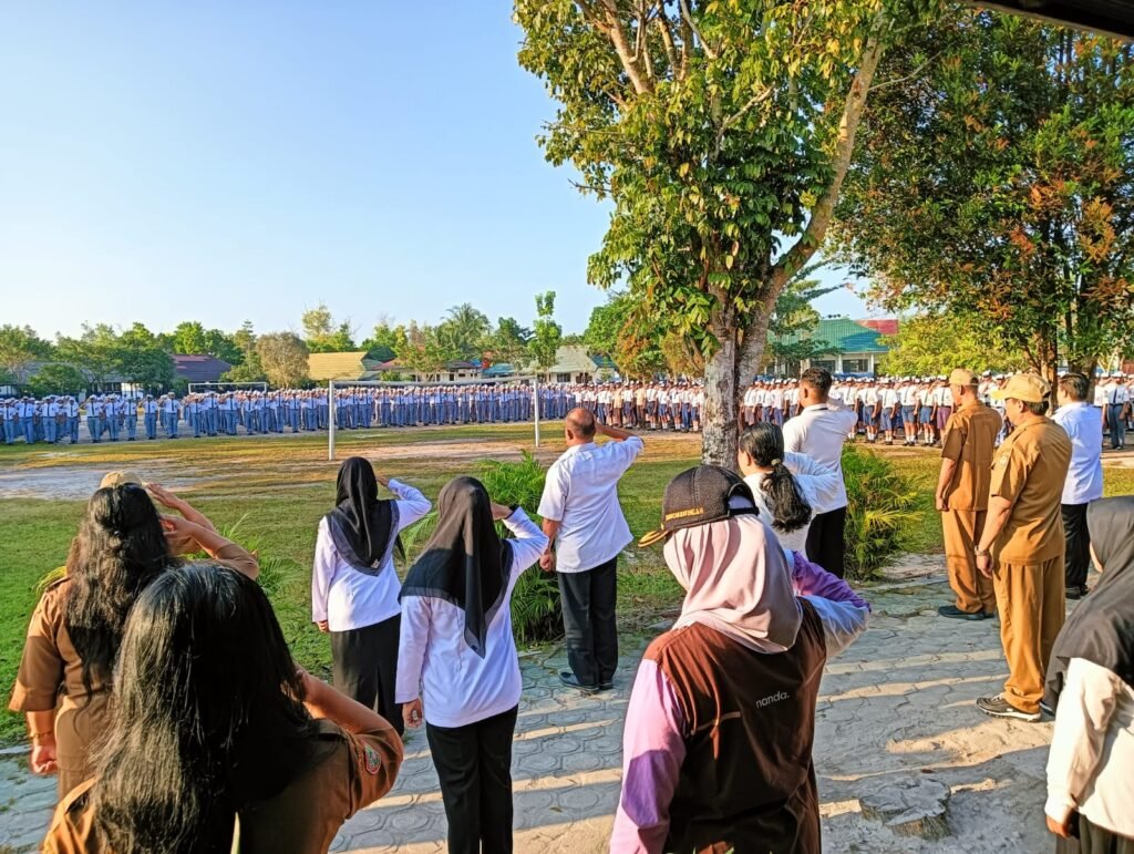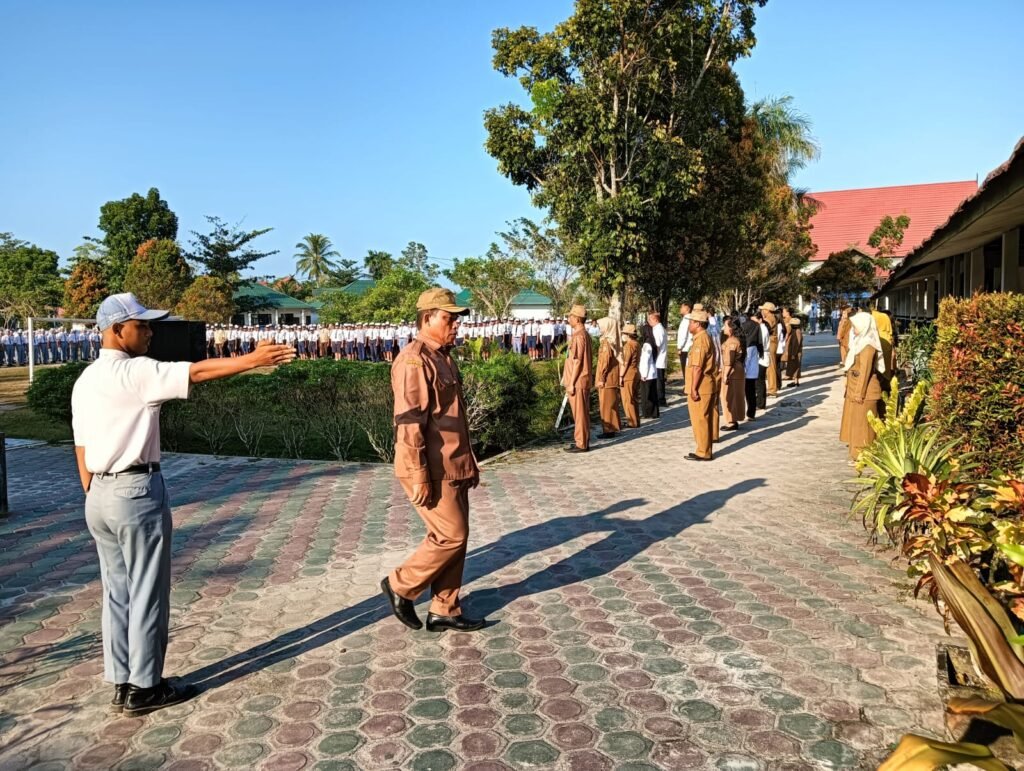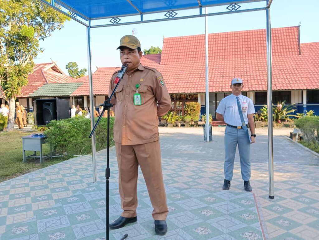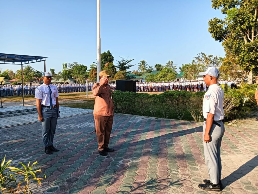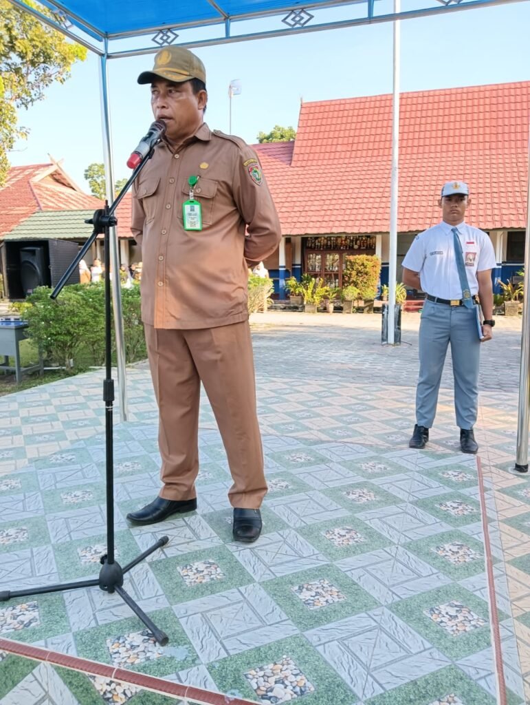 Pembina upacara, Jonkenedy, M.Pd., memberikan amanat dalam upacara bendera Senin, 29 Juli 2024 di halaman SMAN 5 Palangka Raya. Para siswa dan guru serta staf yang berdiri rapi dalam barisan menyimaknya penuh saksama.