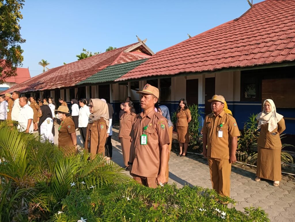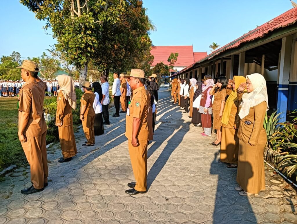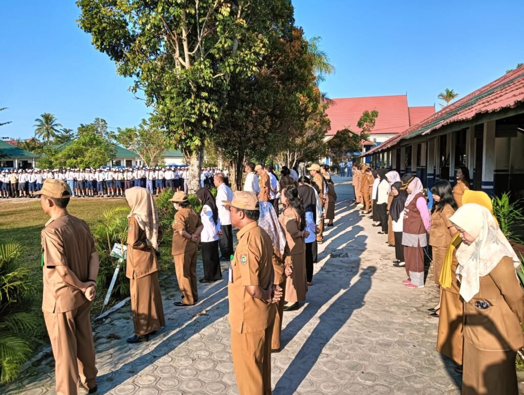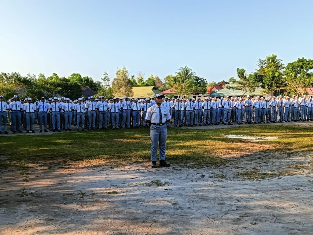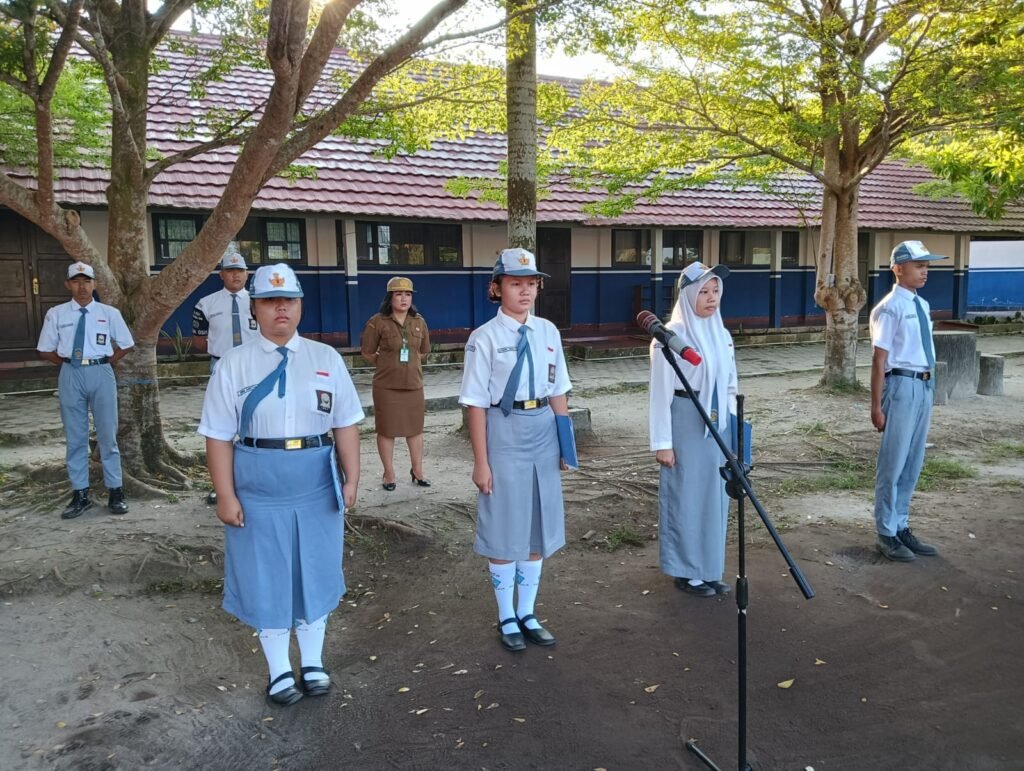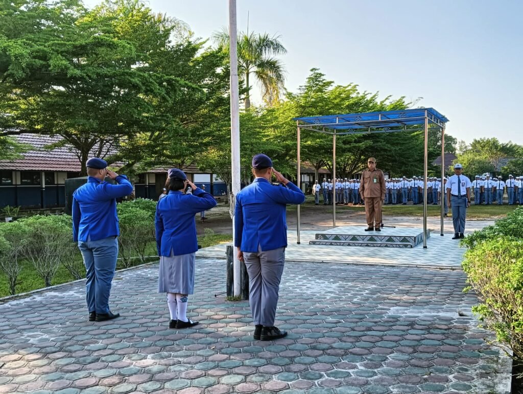 Pembina upacara, Jonkenedy, M.Pd., memberikan amanat dalam upacara bendera Senin, 29 Juli 2024 di halaman SMAN 5 Palangka Raya. Para siswa dan guru serta staf yang berdiri rapi dalam barisan menyimaknya penuh saksama.