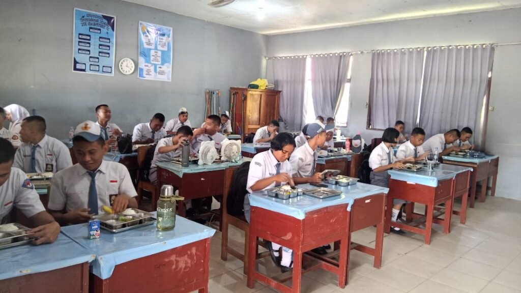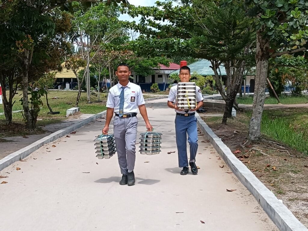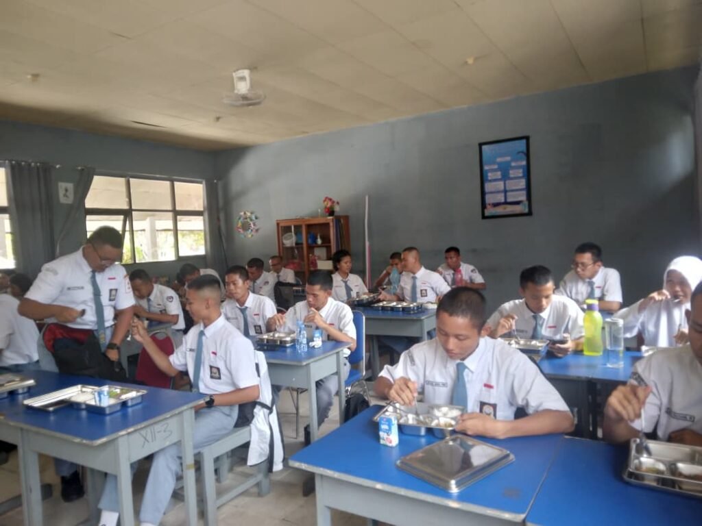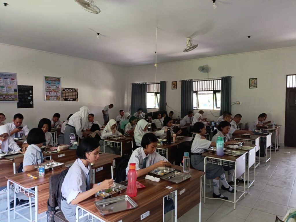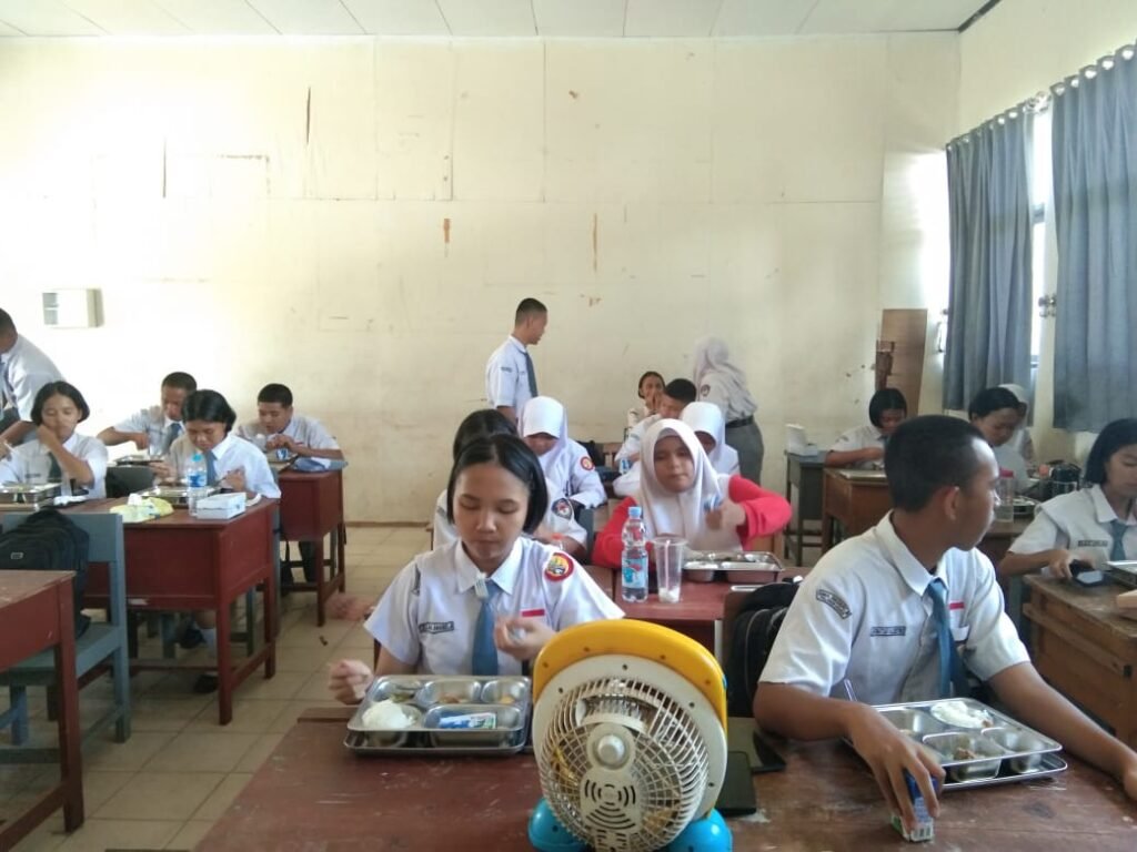 Pukul 11.00 mobil khusus Satuan Pelayanan dan Pemenuhan Gizi (SPPG) tiba di sekolah. Lebih seribu paket MBG dalam ompreng yang bersusun berikat tali pun segera dipindahkan ke Dapur MBG sekolah yang untuk sementara hari ini masih manfaat ruang laboratorium IPA. Satgas MBG sekolah ini pun bergerak cepat. Mereka segera membagikan melalui siswa pengurus kelas sesuai data siswa yang hadir pada hari ini.