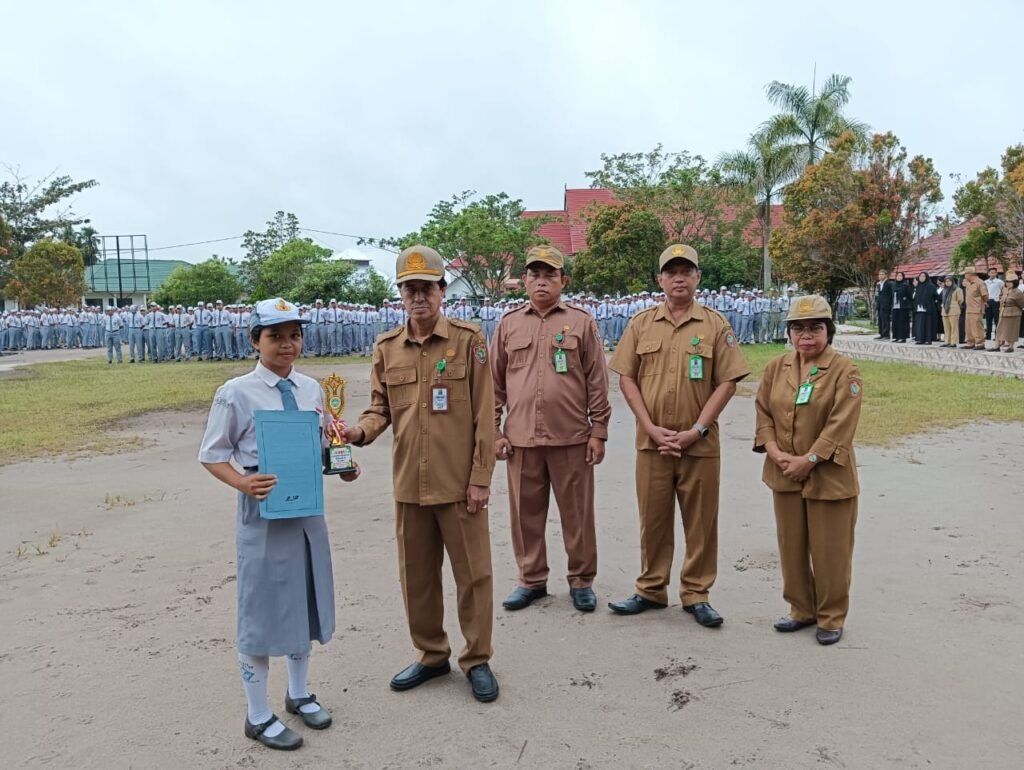 Acara tambahan usai upacara berupa penyerahan piala dari siswa ke pihak sekolah pun berlangsung. Theresia Viona, siswi kelas XI Soshum-2 menyerahkan piala juara 1 Pencak Silat Karsa Mulia Cup IV 2025. Kepala sekolah, Drs. M. Ramli, M.Pd. didampingi para wakasek pun menerimanya penuh apresiasi. Maka aplaus peserta upacara pun memeriahkan suasana. (LJ)